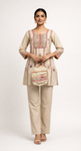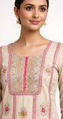 The kurta features a beautifully detailed embroidered yoke highlighted with delicate threadwork, sequins, and soft contrast borders that add depth and richness to the look. Subtle floral motifs are scattered across the body, lending a refined artisanal touch. The straight-cut silhouette and three-quarter sleeves ensure comfort while maintaining a polished appearance.