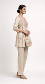 Paired with matching shimmer silk pants in a clean, tailored finish, this coordinated ensemble creates a graceful and effortlessly chic statement—perfect for festive gatherings, daytime celebrations, or elegant evenings out.