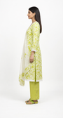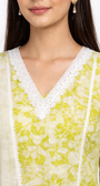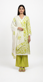 Step into comfort and charm with this refreshing lime-green cotton suit set, designed to keep you cool while looking impeccably stylish. The kurta features an all-over floral print highlighted with delicate white lace detailing along the V-neckline, front panels, cuffs, and hem—adding a soft, feminine finish.