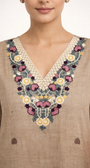 Elevate your everyday ethnic wardrobe with this graceful linen kurta set, crafted in a soothing beige-to-brown ombré palette. Designed for effortless elegance, the kurta features a beautifully detailed V-neckline adorned with multicolor floral embroidery in mauve, mustard yellow, teal, and ivory—arranged in a symmetrical pattern that adds refined charm.