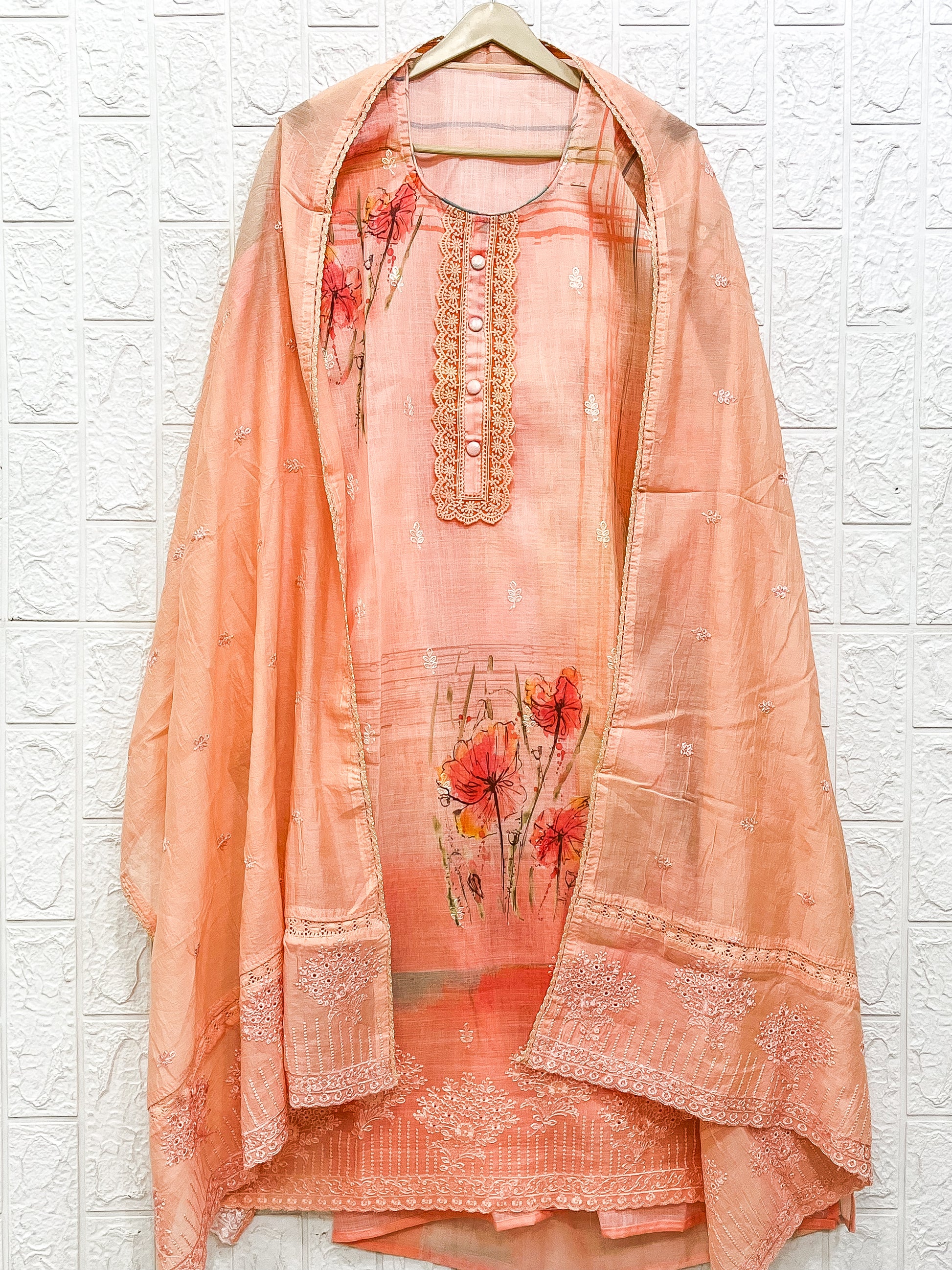 Top - Unstitched Cotton Linen Kurta with Print & Fancy Embroidery on Daman (2.5m)