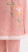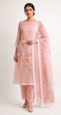 The kurta fabric in sheer Organza is adorned with subtle hand-painted style floral motifs in peach, coral, olive and ivory hues, creating an effortlessly elegant look. A scalloped lace border along the hem enhances the silhouette with a touch of romantic detailing.