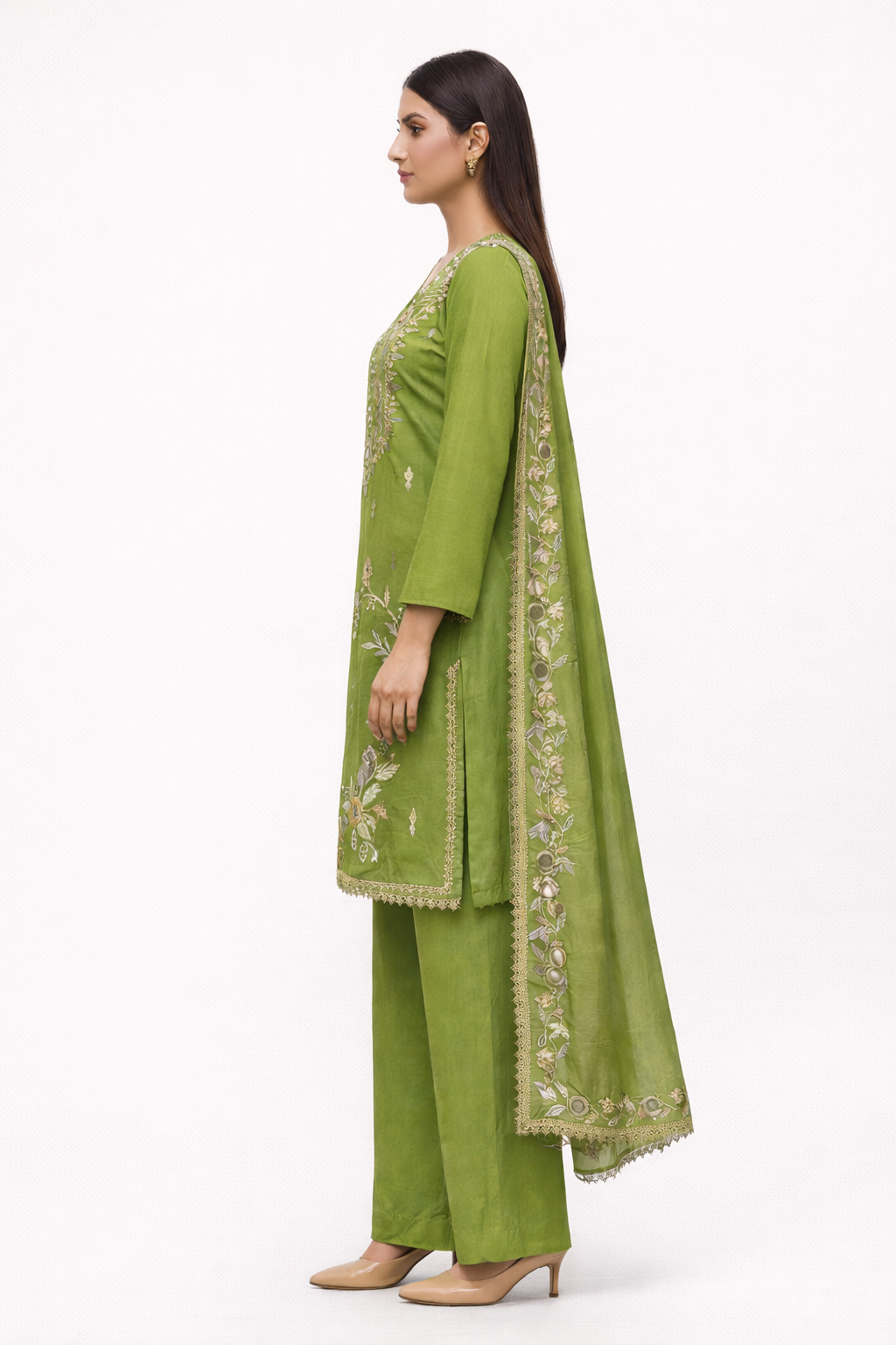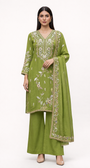 Elevate your ethnic wardrobe with this exquisite unstitched salwar suit set crafted for timeless sophistication and festive charm. Designed in a refreshing olive green tone, the ensemble showcases intricate floral and geometric embroidery highlighted with delicate mirror accents, creating a luxurious handcrafted appeal.