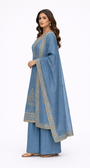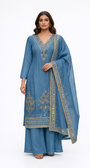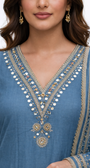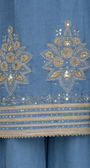 Crafted in a soothing dusty blue tone, the kurta fabric in rich Shimmer Silk is adorned with exquisite mirror-inspired embellishments and intricate thread embroidery along the V-shaped neckline, creating a graceful focal point. Delicate handcrafted motifs highlight the front panel, while ornate floral patterns and embellished borders at the hem add a luxurious finish that truly stands out.
